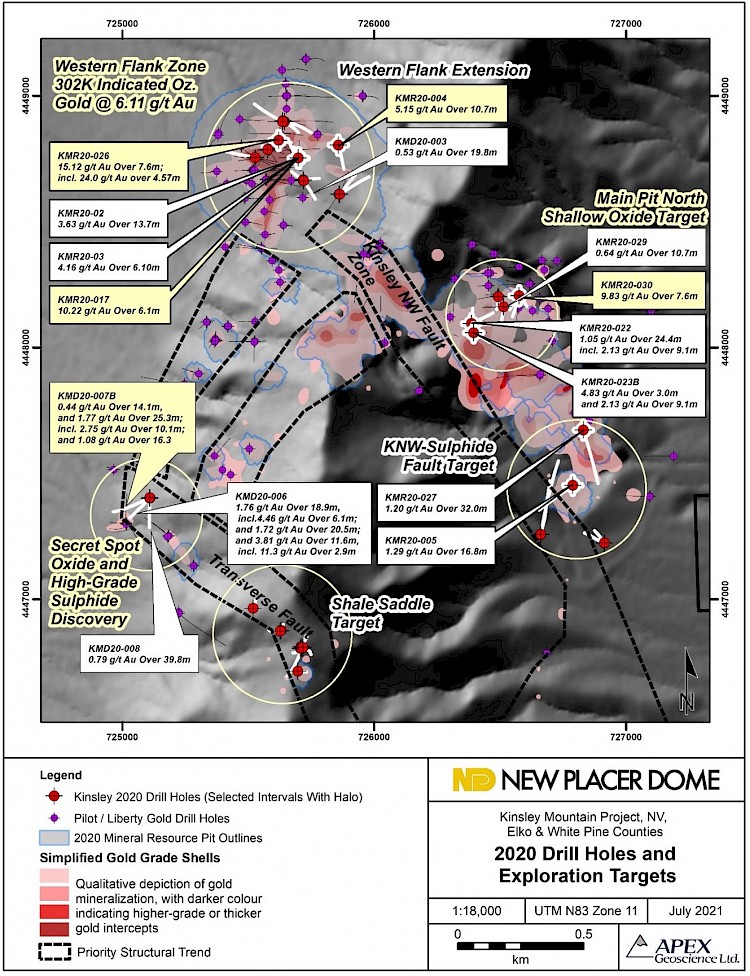 The 2020 Kinsley Mountain reverse circulation (“RC”) and diamond drill campaign comprised 49 drill holes totaling 17,970 metres and tested five targets within the greater resource area (Figure 1). Exploration drilling during 2021 is anticipated to build on new mineralized intercepts and expand the current indicated and inferred resources at the WFZ, Main Pit North Oxide and Secret Spot targets (Figure 2).