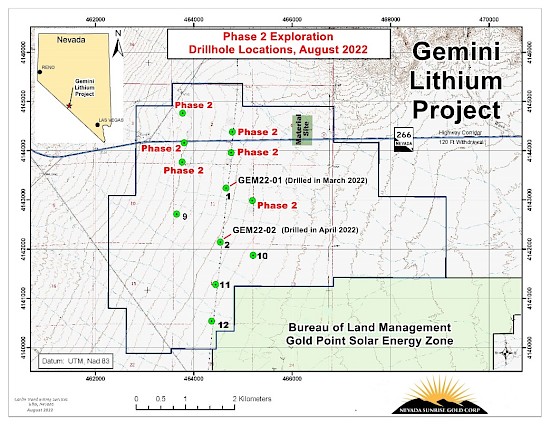 Vancouver, British Columbia, August 15, 2022: Nevada Sunrise Gold Corp. (“Nevada Sunrise”, or the “Company”) (TSXV: NEV, OTC: NVSGF) is pleased to announce that it has received an amended exploration permit from the U.S. Bureau of Land Management (the “BLM”) for the Company’s 100%-owned Gemini Lithium Project (“Gemini”), located in the Lida Valley basin in Esmeralda County, Nevada. The amended permit increases the number of proposed borehole locations to twelve (12), which includes the two successful boreholes that intersected significant lithium values drilled during the Company’s maiden drilling program in March and April 2022 (see Nevada Sunrise news releases dated May 18, 2022 and June 6, 2022).