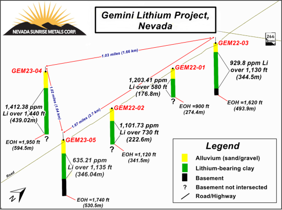 In March and April 2022, Nevada Sunrise drilled two reverse circulation boreholes for a total of 2,020 feet (615.85 metres) in its maiden drilling program at Gemini. The drill sites were located within a defined gravity low that hosts conductive layers detected by historical ground electromagnetic surveys. The results from the first two holes at Gemini represented a new discovery of lithium mineralization in the western Lida Valley, which was not historically drill tested for lithium (see Nevada Sunrise news release dated May 18, 2022). Three additional boreholes totaling 5,310 feet (1,618.9 metres) were completed from October 2022 to April 2023, with each intersecting lithium mineralization (see Nevada Sunrise news release dated May 24, 2023). Metallurgical tests carried out on Gemini lithium-in-sediment mineralization in 2023 has achieved a 90.2% lithium extraction rate (see Nevada Sunrise news release dated June 5, 2023).