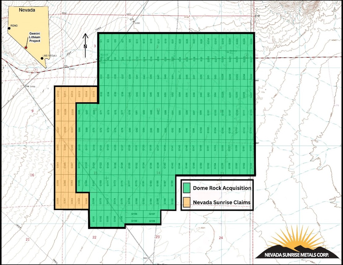 Vancouver, British Columbia – August 19, 2025 – Nevada Sunrise Metals Corporation (TSXV: NEV, OTCBB: NVSGF) (“Nevada Sunrise” or the “Company”) announced today that the Company has executed a purchase and sale option agreement (the “Agreement”) with Dome Rock Resources, LLC (“Dome Rock”, or the “Purchaser”), a private South Dakota company, whereby Dome Rock has agreed to purchase two hundred and twenty-three (223) unpatented lode claims (the “Claims”) from the Company, which represent the core claims of the Gemini Lithium Project (“Gemini”, or the “Project”). Gemini is located in the Lida Valley near the town of Gold Point in Esmeralda County, Nevada. Following the closing of the Transaction, Nevada Sunrise will retain twenty-six (26) unpatented lode claims located immediately to the west of the Claims (see Figure 1).
