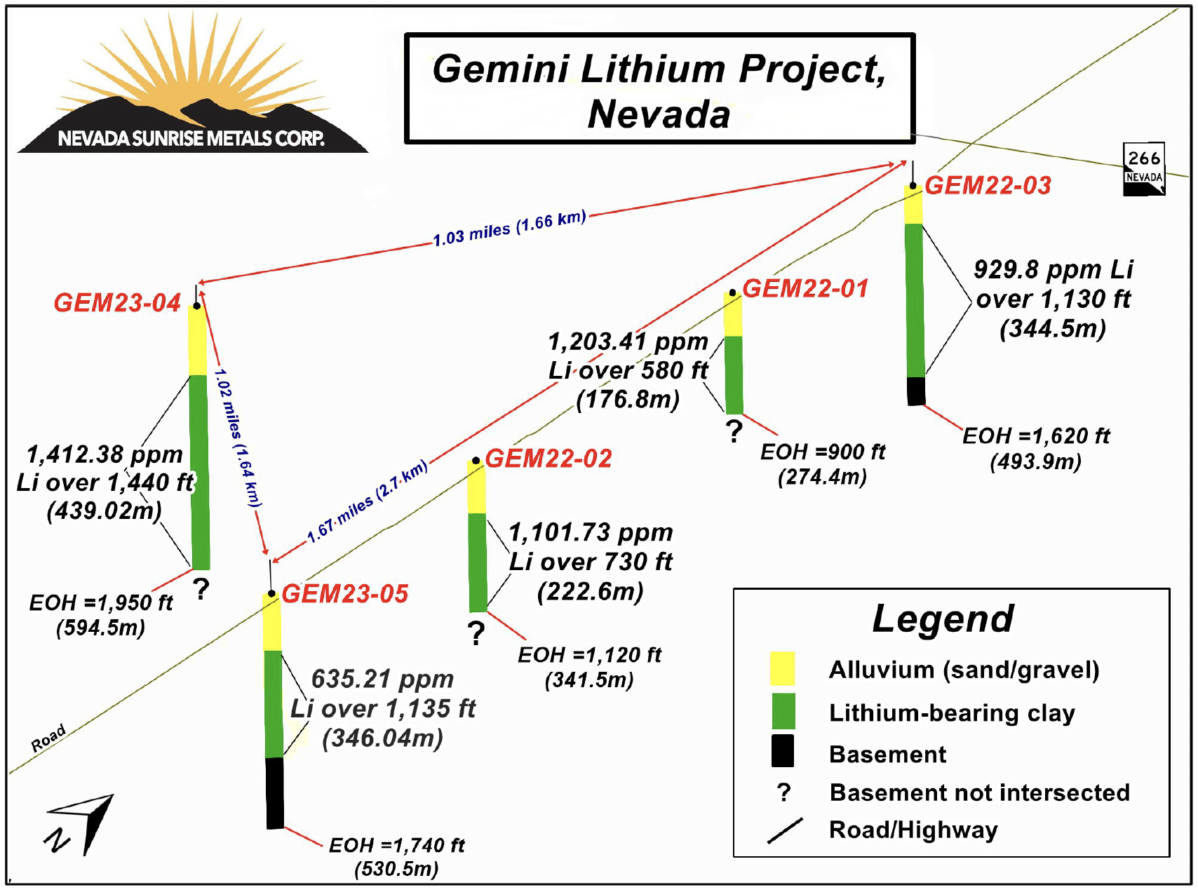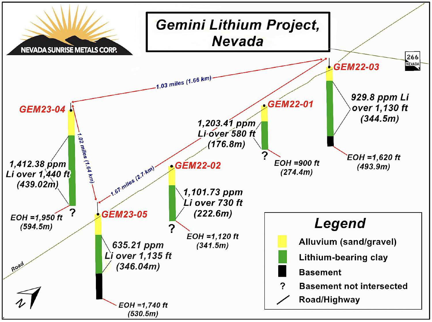 Three separate follow-up time-domain electromagnetic (“TDEM”) surveys over Gemini carried out in 2016 and 2022 by Nevada Sunrise each detected conductive zones within the sub-basins interpreted to represent conductive zones at depth located well below the non-conductive alluvium at and near surface.